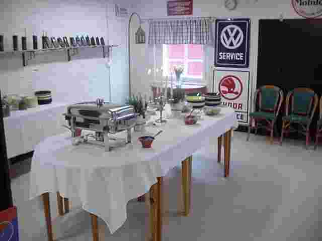| Caféet fungerar också som beställningsrestaurang. Lunch eller Middag kan ordnas för upp till 70 personer i de rustikt trivsamma utrymmena. Menyerna är flexibla och anpassas efter kundens behov.Restaurang-verksamheten har A-rättigheter.Förutom våra egna publikdagar har vi specialiserat oss på PR-tillställningar och maskinvisningar. Vi arrangerar tillställningar både ute och inne och utnyttjar den mångsidiga omgivningen och naturen. |